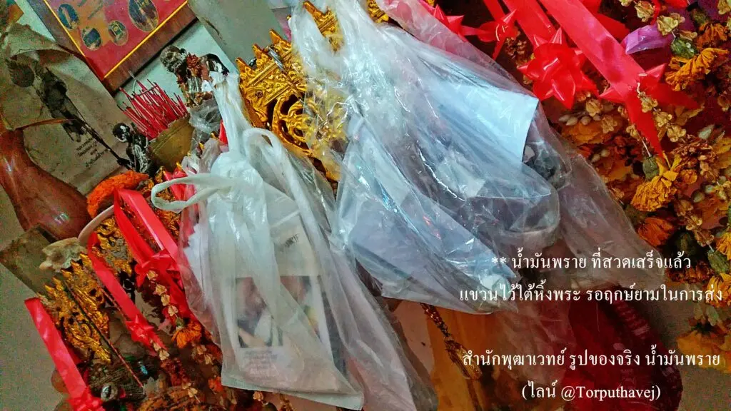 เมื่อสวดเสร็จพี่หมอจะเอาน้ำมันมาแขวนไว้ใต้หิ้งพระที่สำนัก เพื่อสวดเพิ่มเติมและหาฤกษ์ยามในการส่งให้ศิษย์ไปใช้ทาตนเอง ทาแฟน จะส่งไปแบบไม่ดูฤกษ์ดูยามเลยจะมีปัญหาภายหลังได้ และจะแนะนำให้ศิษย์ที่ได้รับอีกครั้งหนึ่งจะมีฤกษ์ยามต้องห้ามในการใช้ ซึ่งจะแจ้งอีกครั้งหนึ่ง ในรูปนอกจากพิธีทำน้ำมันพรายก็จะเต็มไปด้วยรูปถ่ายที่ทำพิธีต่างๆ เยอะมาก ผ้าขาวที่รอใช้ทำพิธีในป่าช้า ก่อนดินที่คนส่งมาสวดเพื่อให้ขายที่ได้ รูปที่ผ่านการผูกดวงทำเสน่ห์ก็มี ตลอดจนคนมาทำพิธีตั้งไว้แล้วไม่กลับมาเอา ที่เป็นคนท้องถิ่น
